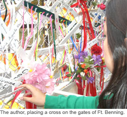 It wasn't even until a few weeks into the volunteer work that someone told me about the United States' involvement in the massacres. The military dictators and officers that created the structures and protocols for combating "communism" in the 1980s and 1990s attended military training programs in the United States. Their armies are funded generously by our government. Some were politically supported in the world arena when they staged their coup d'etats against democratically elected administrations. I know that if the people of the United States heard even a few of the stories from people that had miraculously survived village massacres, they would be in Fort Benning every year en masse, protesting the School of Americas with us.