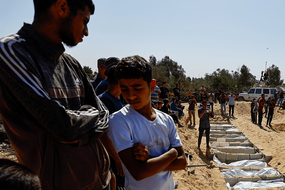 Youths react at a mass burial site of unidentified bodies of Palestinians who had been held in Israel during the war, after they were handed over by Israel, amid a ceasefire between Israel and Hamas in Gaza, in Deir Al-Balah, in the central Gaza Strip, Oct. 22, 2025. REUTERS/Mahmoud Issa
