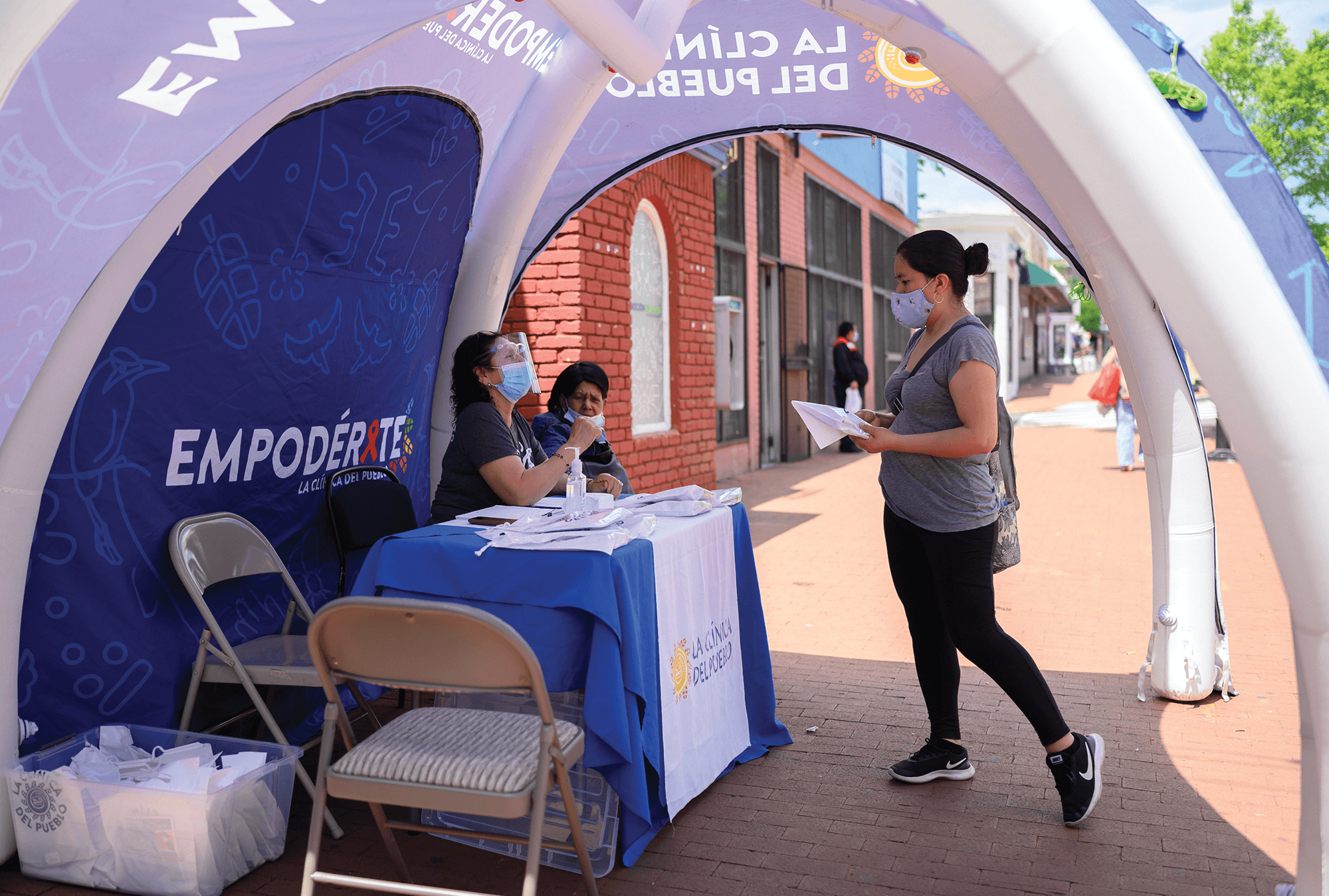 La ClĂnica del Pueblo staffers register members of the community for the COVID-19 vaccine in front of the building.